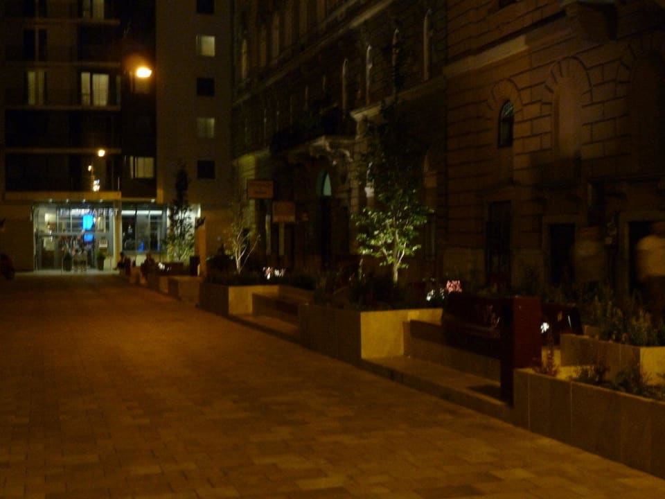 Das ist die kleine Straße (Fußgängerzone) die zum Hotel (linker Bildrand) führt. Hier gibt es grünbepflanzte Beete und sehr schön im Dunkeln beleuchtete Sitzgelegenheiten.