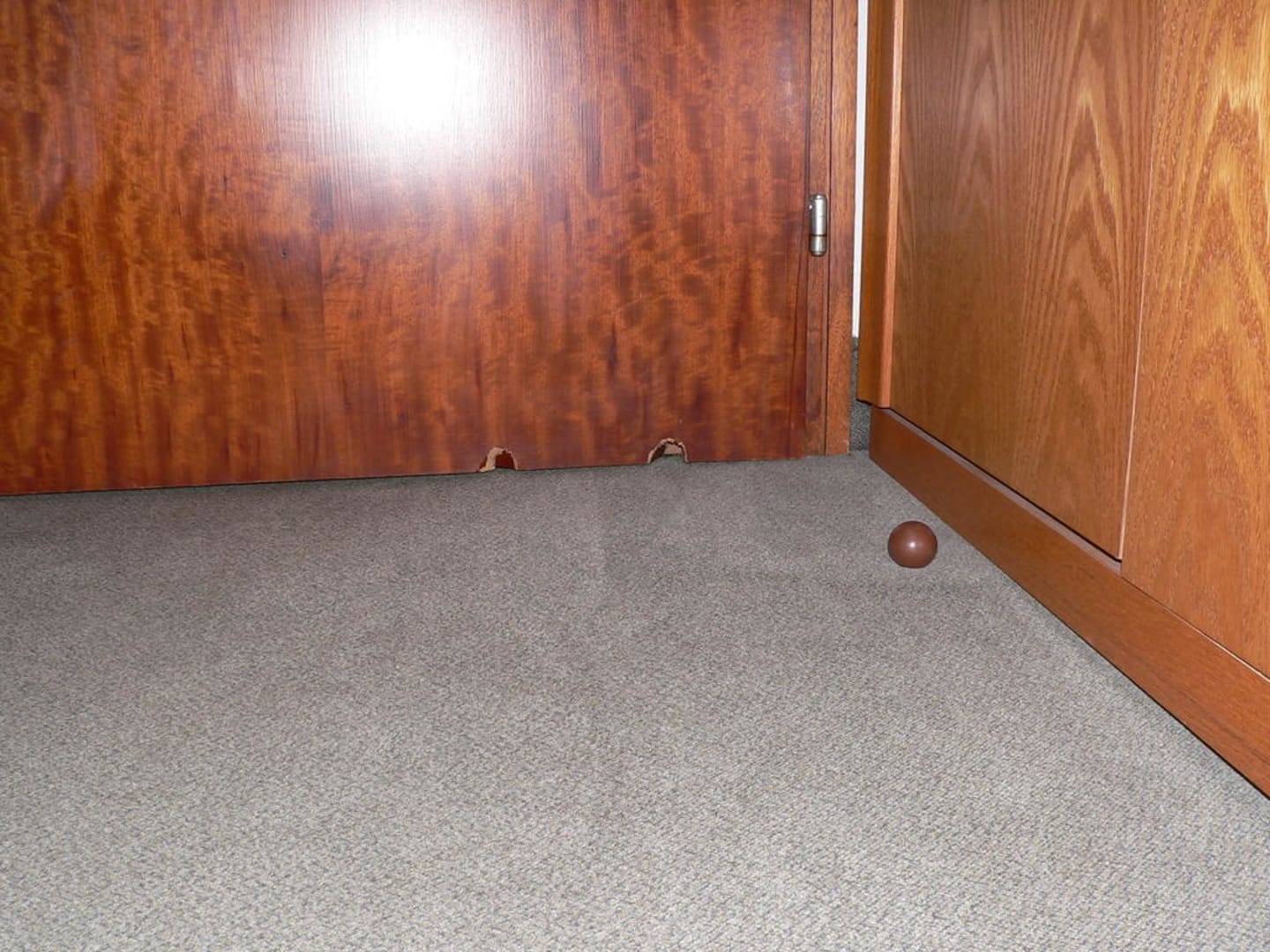 2 Löcher in der ZimmertüreDer Türstopper durchstieß das Furnier. Danach wurde er versetzt - der Schaden nicht behoben....