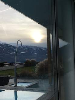 Blick aus dem Hallenbad - draussen vorwinterlich und drinnen kuschelig warm