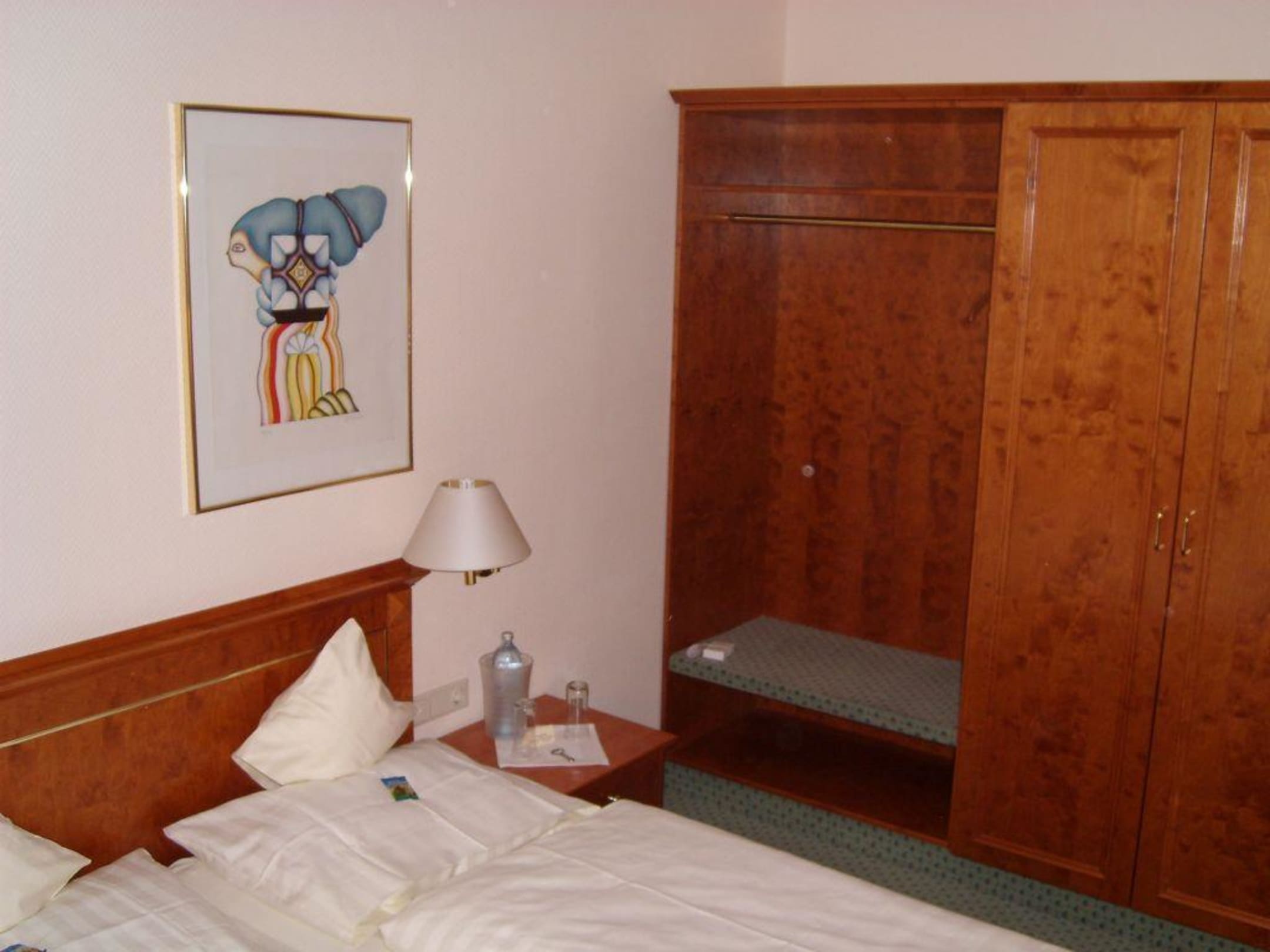 Blick aufs Bett, Schrank im Hintergrund