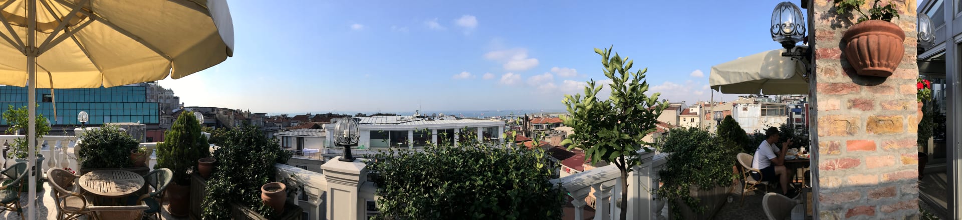 Panoramic view of the Marmara Sea from the rooftop garden patio.