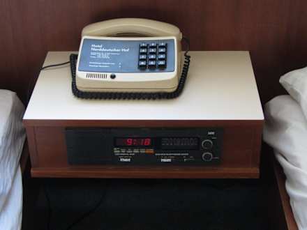 Dies ist das alte Telefon auf unserem Zimmer, tatsächlich schon ohne Wählscheibe auf dem uralten Nachtisch mit eingebautem Radio. 70er Jahre Charme