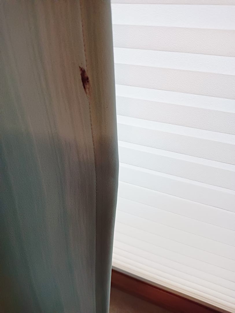 Gardine im Schlafzimmer mit großem Fleck, Nutella oder Schlimmeres?