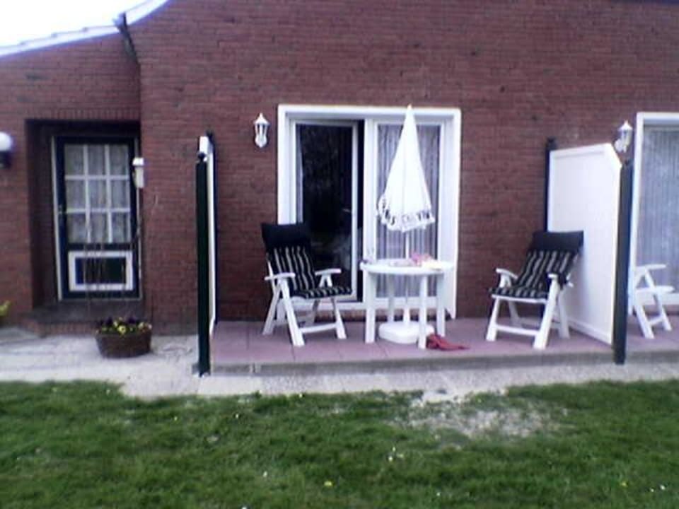 Hier ist ein Zimmer des Gästehauses mit Terrasse zu sehen.