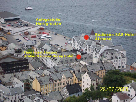 Blick vom Aussichtspunkt zum Hotel und der Hurtigrouten-Anlegestelle