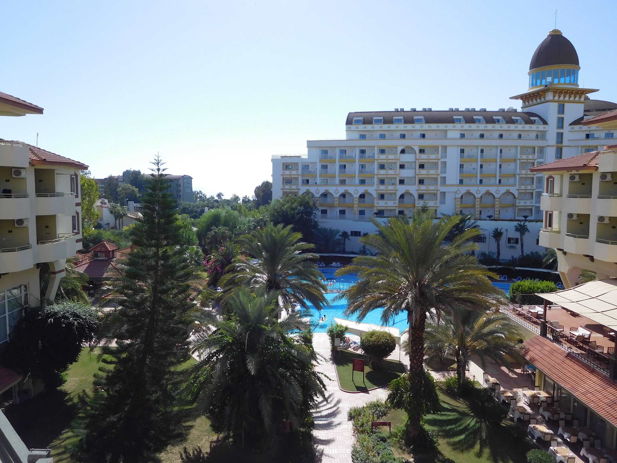 Sicht vom Balkon auf den Pool und Meer