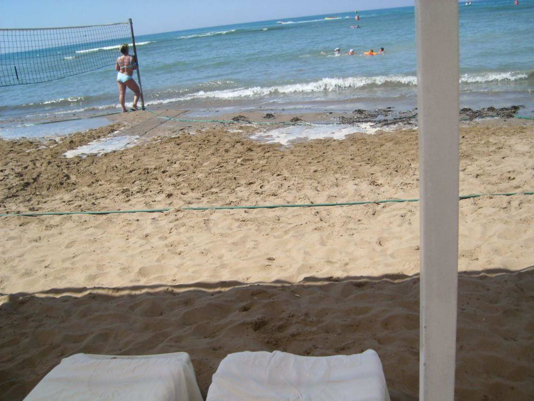 Die Abtrennungen wurden mit einem Gartenschlauch gekennzeichnet. Das Feld grenzte ans Meer und an die Liegen. Die erste Reihe musste immer flüchten.