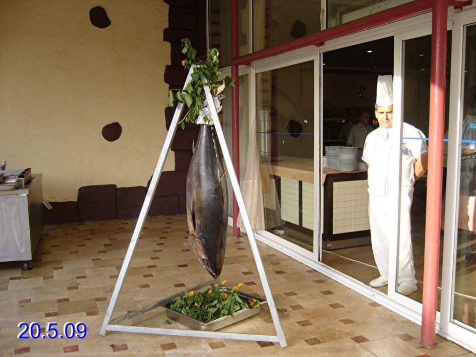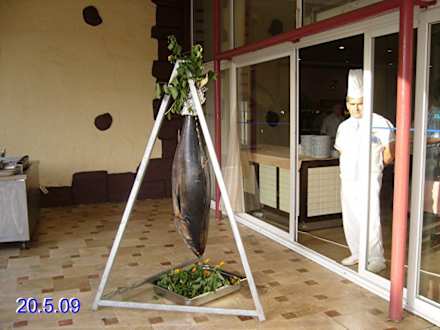 Thunfisch hängt am Galgen zum Verzehr.