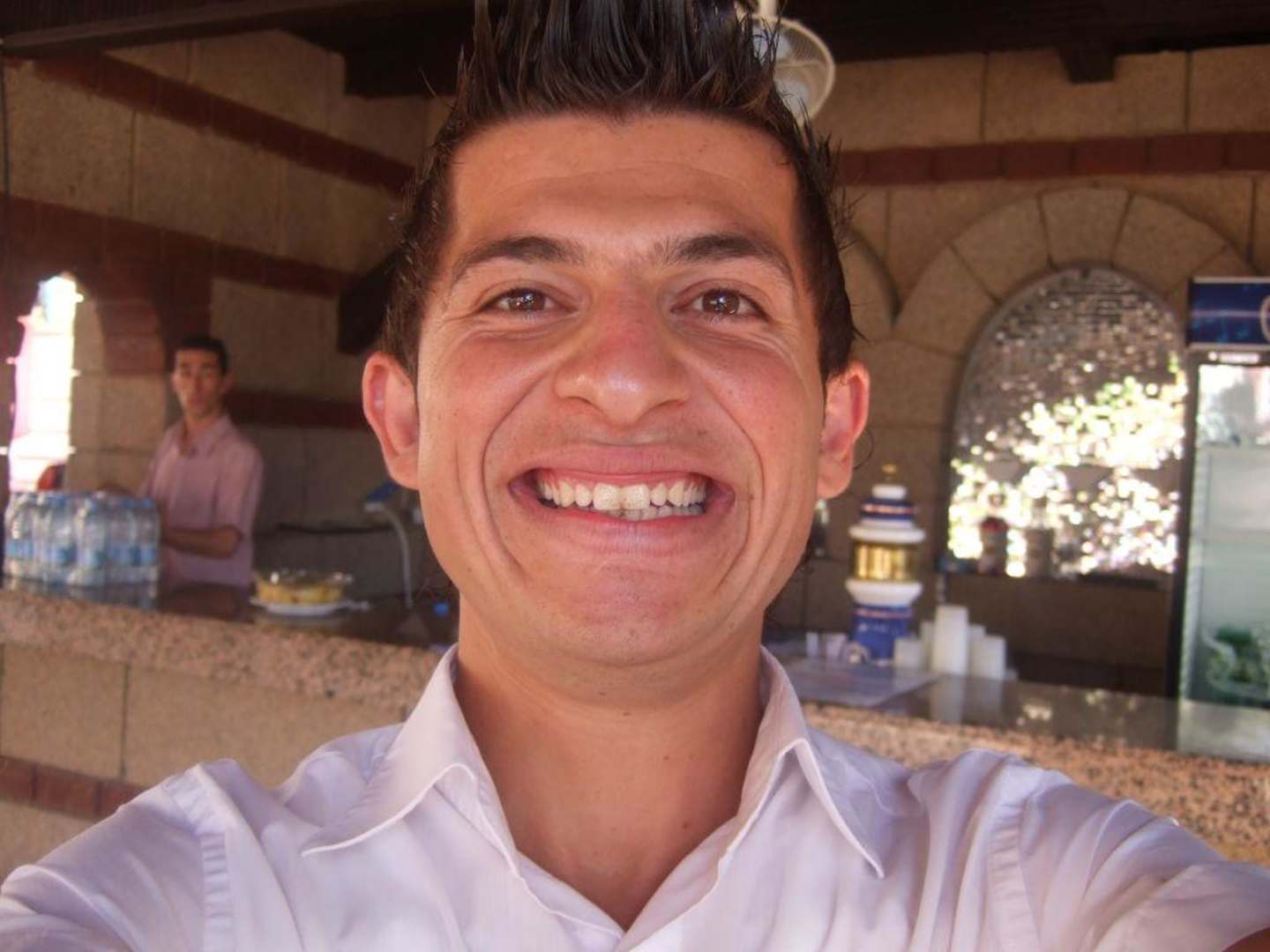 Kellner mit hohen HaarenDer Kellner Mustafa von der Poolbar mit seiner aussergewöhnlichen Lache und hochgegelten Haaren