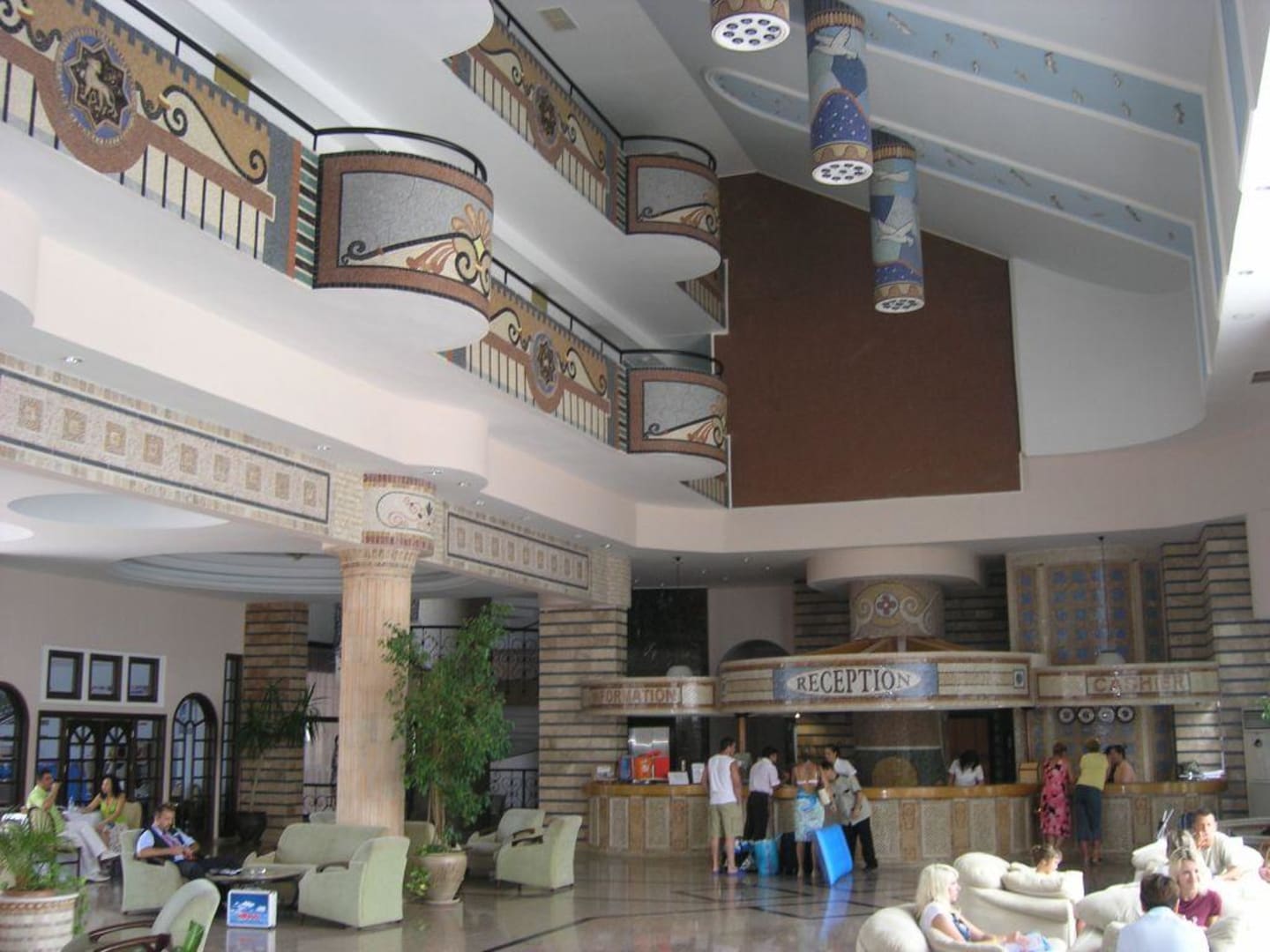 Rezeptionist im Mosaik-Stil gestaltet/In der Lobbi sind viele Sitzgelegenheiten wo man Tagsüber seinen Kaffee trinken kann