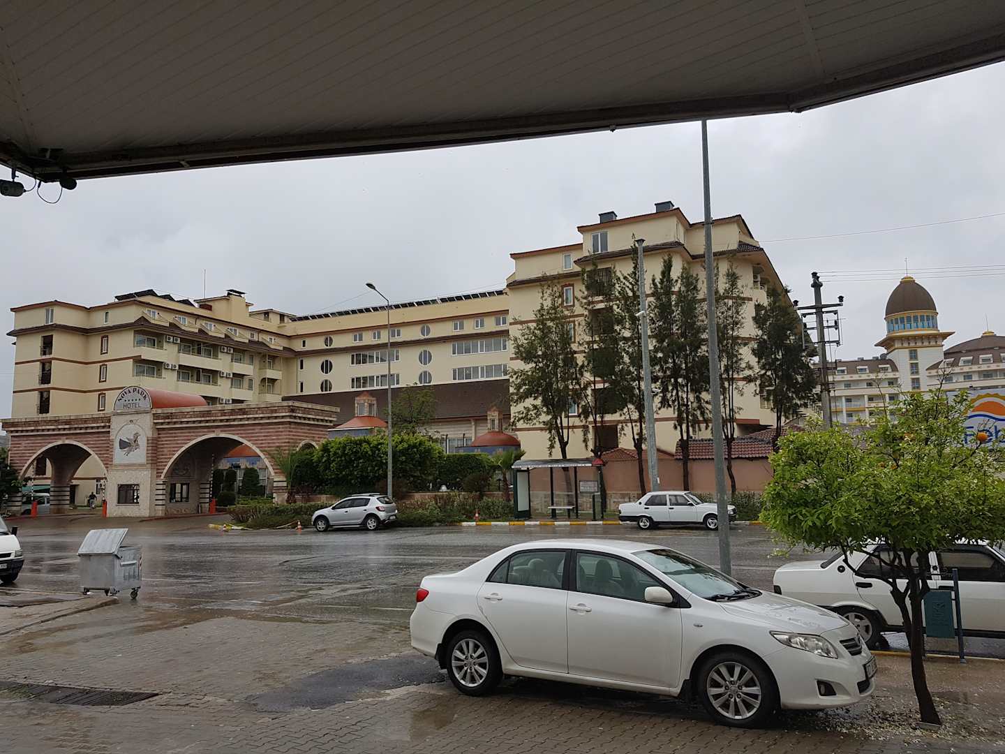 Blick von der gegenüberliegenden Straßenseite auf den Eingangsbereich des Hotels