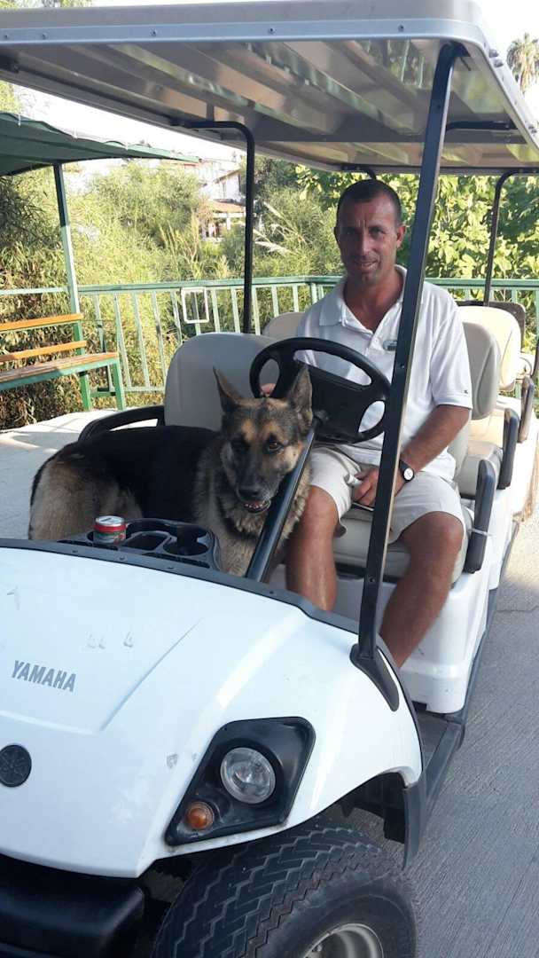 Der nette Fahrer und Pashader wirklich nette Fahrer vom Strandshuttle mit Pasha dem Schäferhund von der Security