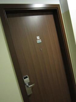 Die Zimmertür aus dunklem Holz. Zu öffnen mit einer modernen Keycard. Die Tür verfügte darüber hinaus über einen Türspion (um zu sehen wer eventuell an der Tür klopft ohne diese gleich öffnen zu müssen).