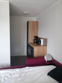 Schlafcouch und direkt daneben die Küche