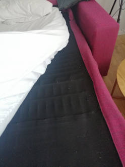 Das Metall- / Holzgestell der Schlafcouch, auf dem nur ein ca. 4cm dicker Matratzentopper lag. Die ganze Schlafcouch war eine Berglandschaft – es gab keine ebene Fläche. Dann diese scharfen Kanten des Bettgestells, wie hier im Bild zu sehen.