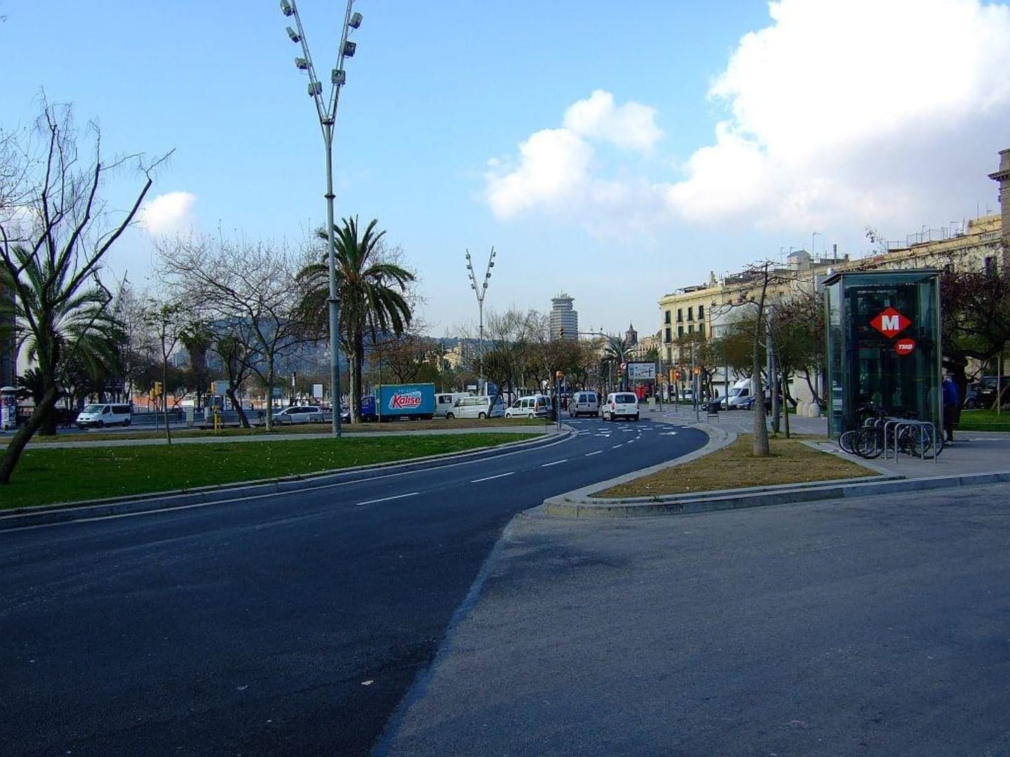 Die Metro liegt nur wenige Schritte vom Hotel Oasis entfernt. Im Hintergrund ist der Yachthafen, die Kolumbussäule und der Berg Montejuic.