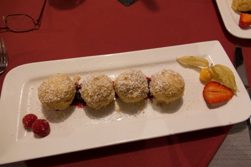 Topfenknödel auf Heidelbeerbeet
