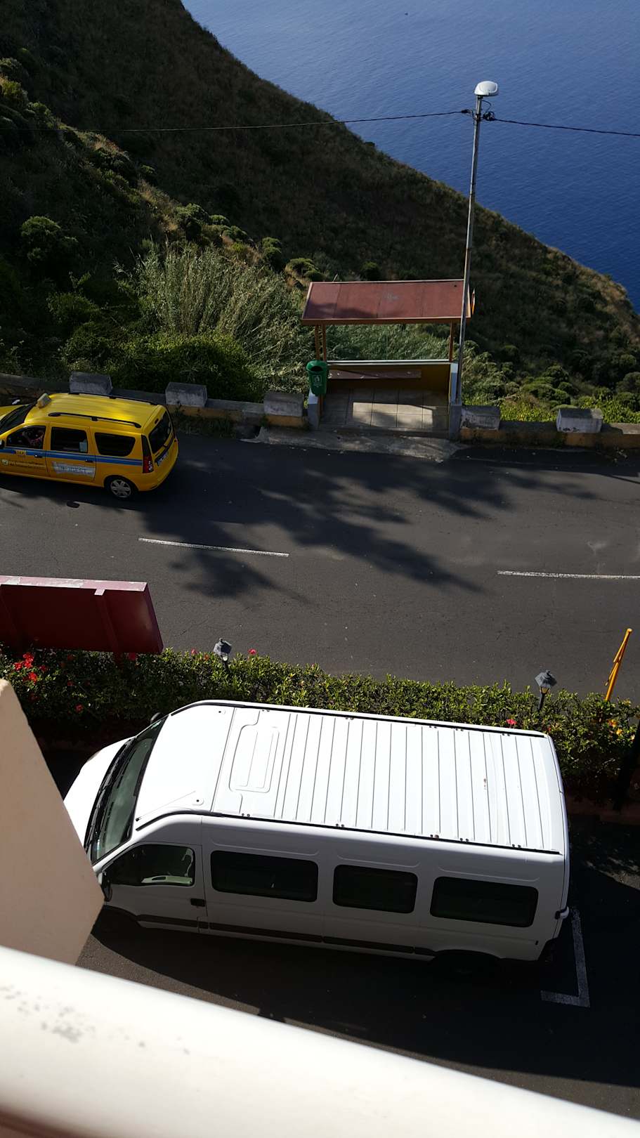 Blick aud Parkplatz, Strasse und Bushaltestelle