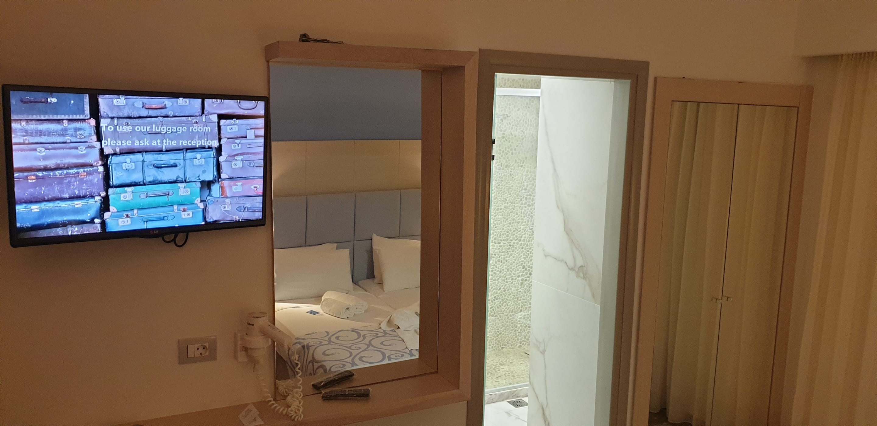 Fernseher und Spiegel sowie eingang ins Bad und Kleiderschrank rechts