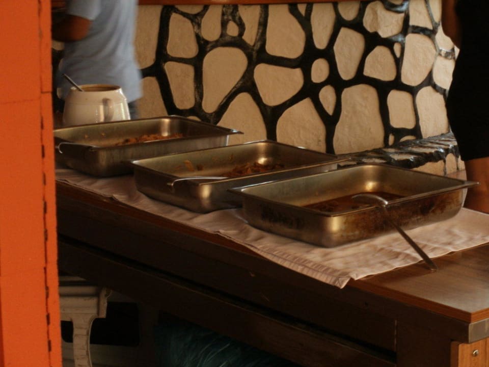 Behältnisse der einzigen HauptspeiseHieraus wurde die Hauptspeise vom Personal auf die Teller der Gäste getan. UNGLAUBLICH