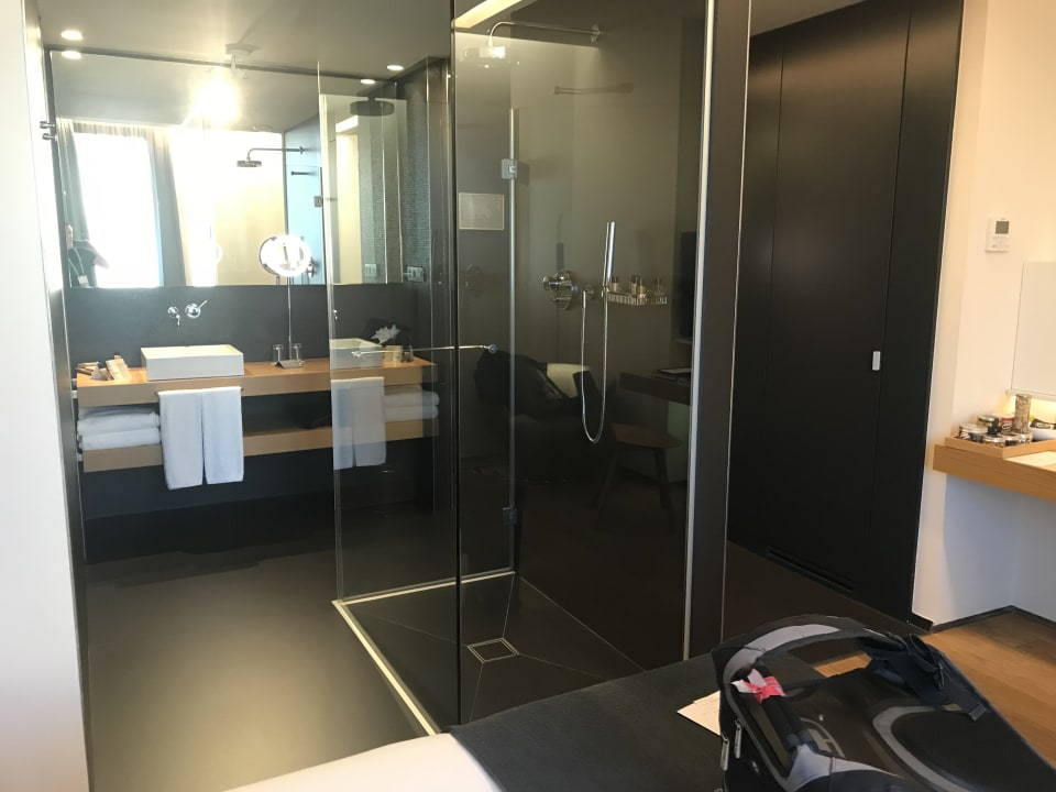 Dusche mitten im Zimmer. Die Toilette ist "hinter der Wand" versteckt.