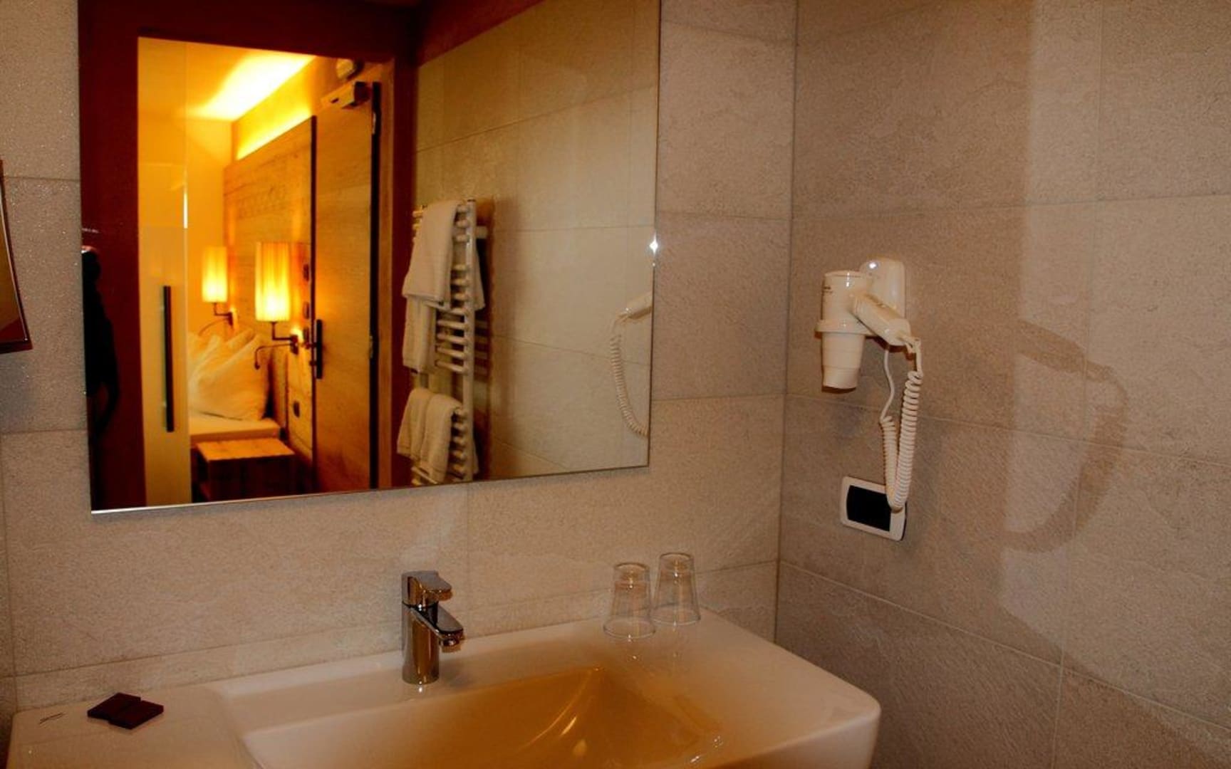 Blick ins benachbarte Badezimmer - hier mit hellen Fliesen