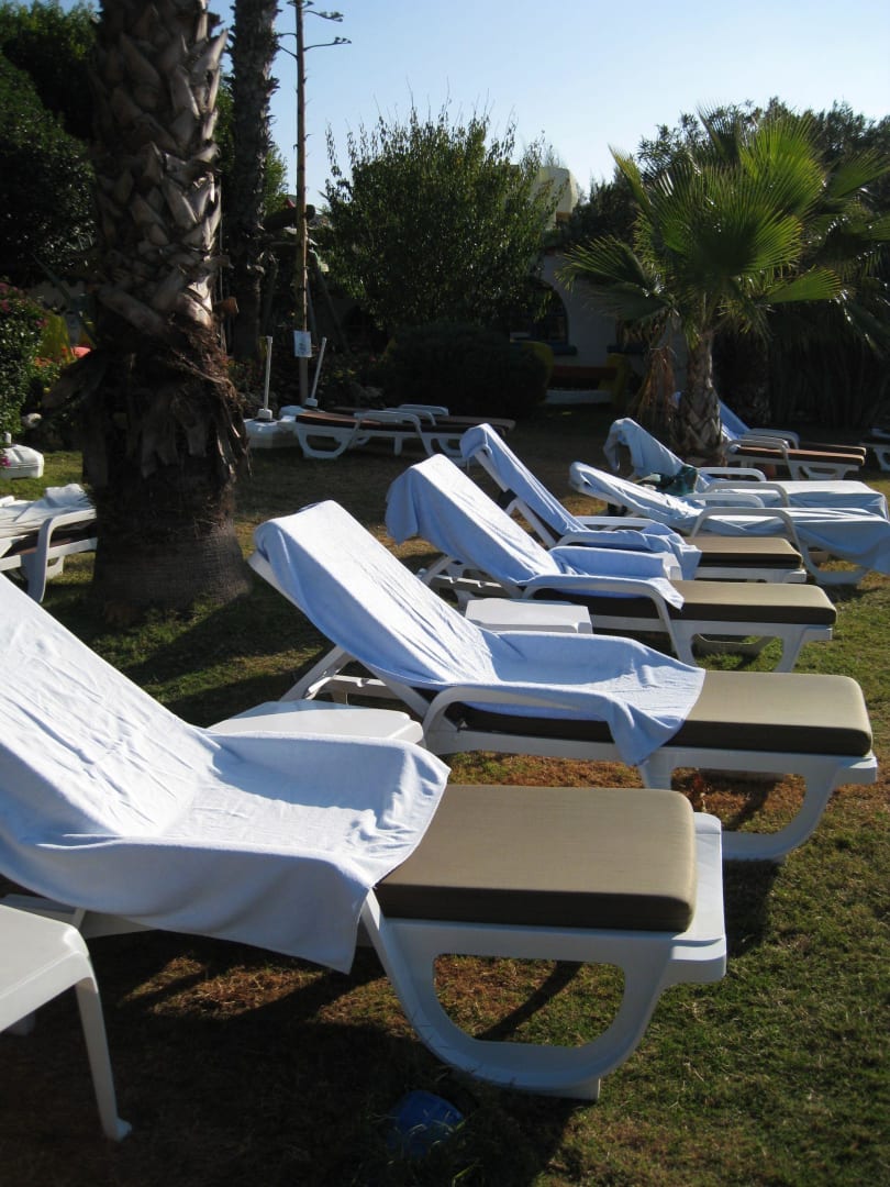 Morgens Früh sah man dass schon viele Liegen an den sonnigstens Plätzen reserviert worden waren. -Freizeitsport einiger Senioren: -Früh morgens Liegen reservieren, sie aber erst ab 10Uhr oder später nutzen.
