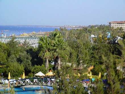 Meerblick Richtung Antalya über die Anlage des Hotel Terrace aufgenommen aus dem vordersten Zimmer im linken Flügel - Aussenseite über der Anlieferstraße.