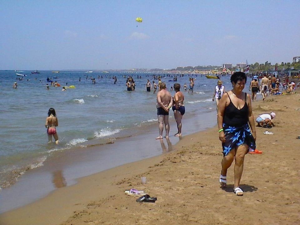 Strand am Oleander, Blick Richtung AntalyaSchöner flach abfallender Sandstrand, Anfang Juli aber schon sehr voll da dort sehr dichte Hotelbebauung ist.