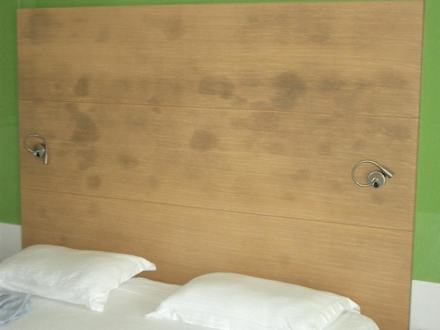 Viele Stockflecken am Kopfteil des Doppelbettes