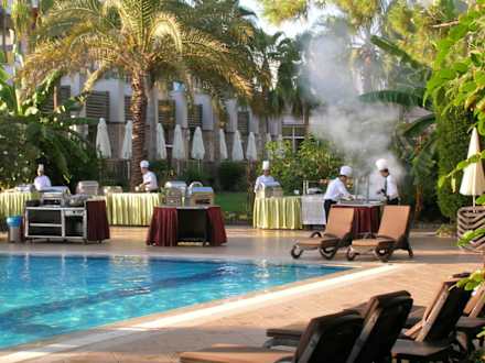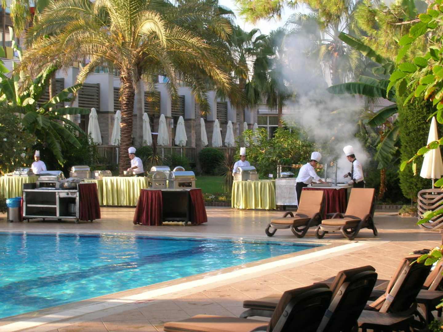 Pool am Abend mit Grillstationen