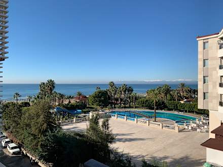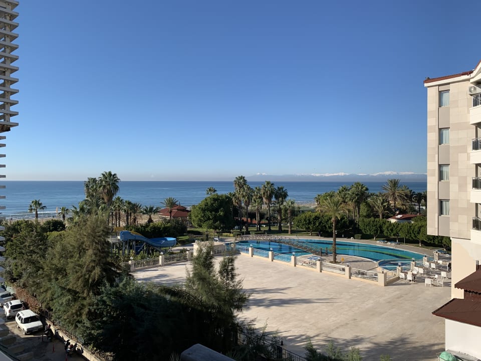 Ausblick vom Balkon im Haus Rose gebucht mit Landblick. Der Pool ist vom Nachbarhotel.