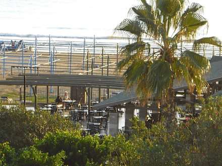 Blick vom Balkon/Suite auf Strandbar, Strand und Meer