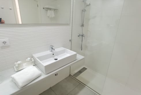 ZimmerDusche nur mäßig abgetrennt, daher muss man sehr aufpassen, nicht das ganze Bad zu fluten.