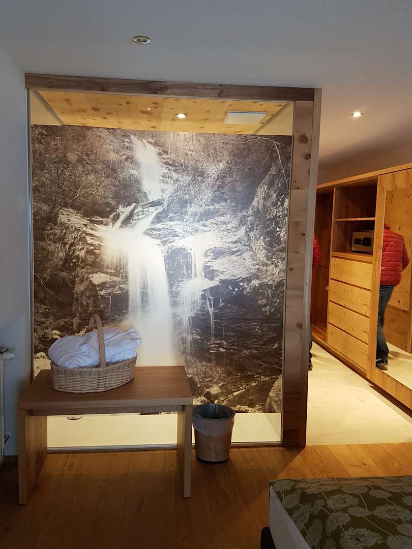 Blick auf die Badezimmerwand Blick auf den Saunakorb, Ablage haben wir als Kofferablage genutzt