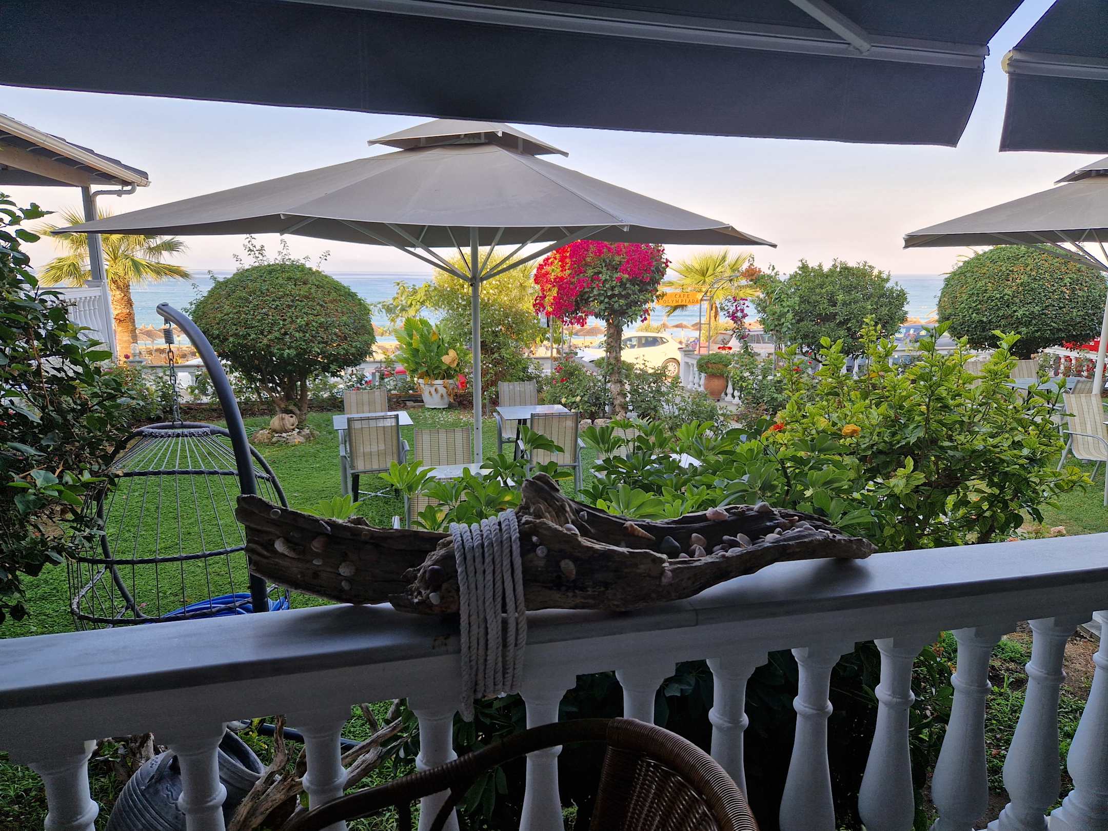 Garten vor dem Hotel. Im Hintergrund der Strand.