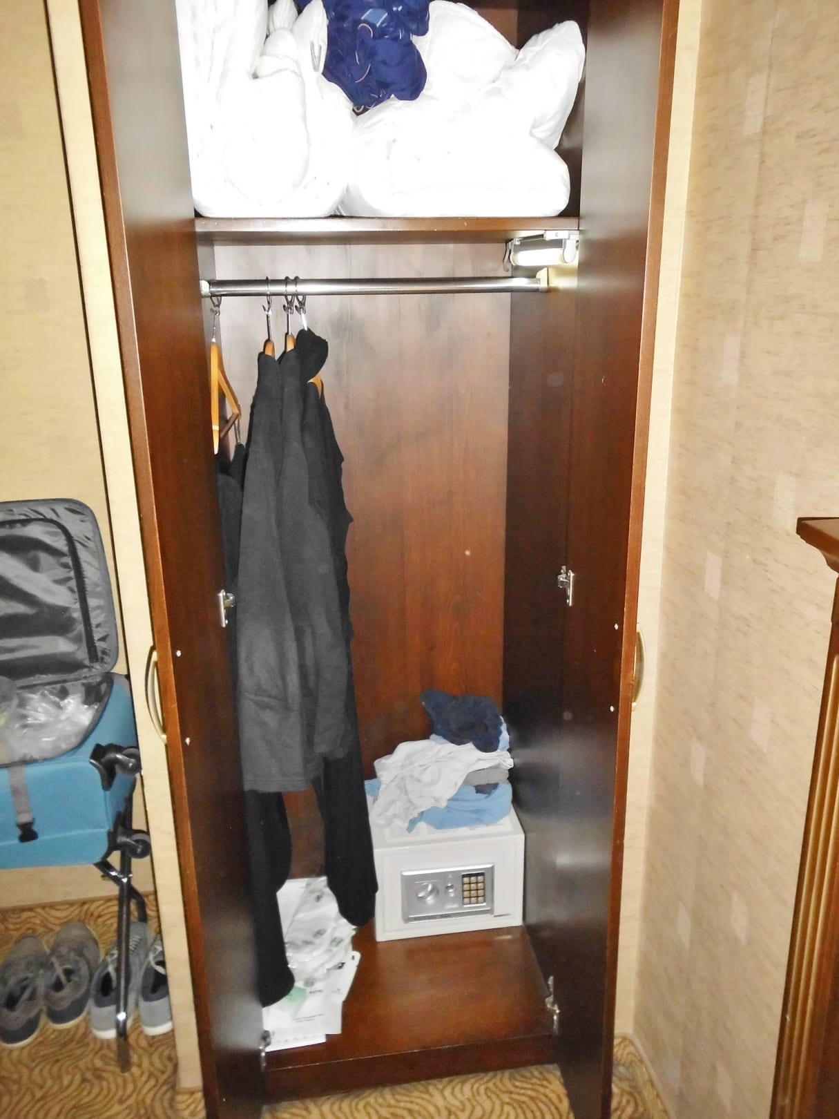 ZimmerschrankDas ist der einzige Schrank für 2 Personen. Keine Ablagefächer vorhanden. Safe vorhanden aber die Erreichbarkeit ist nicht optimal