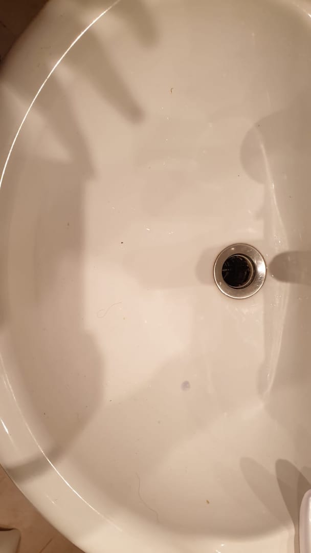 Zimmer bezogen, Waschbecken dreckig.