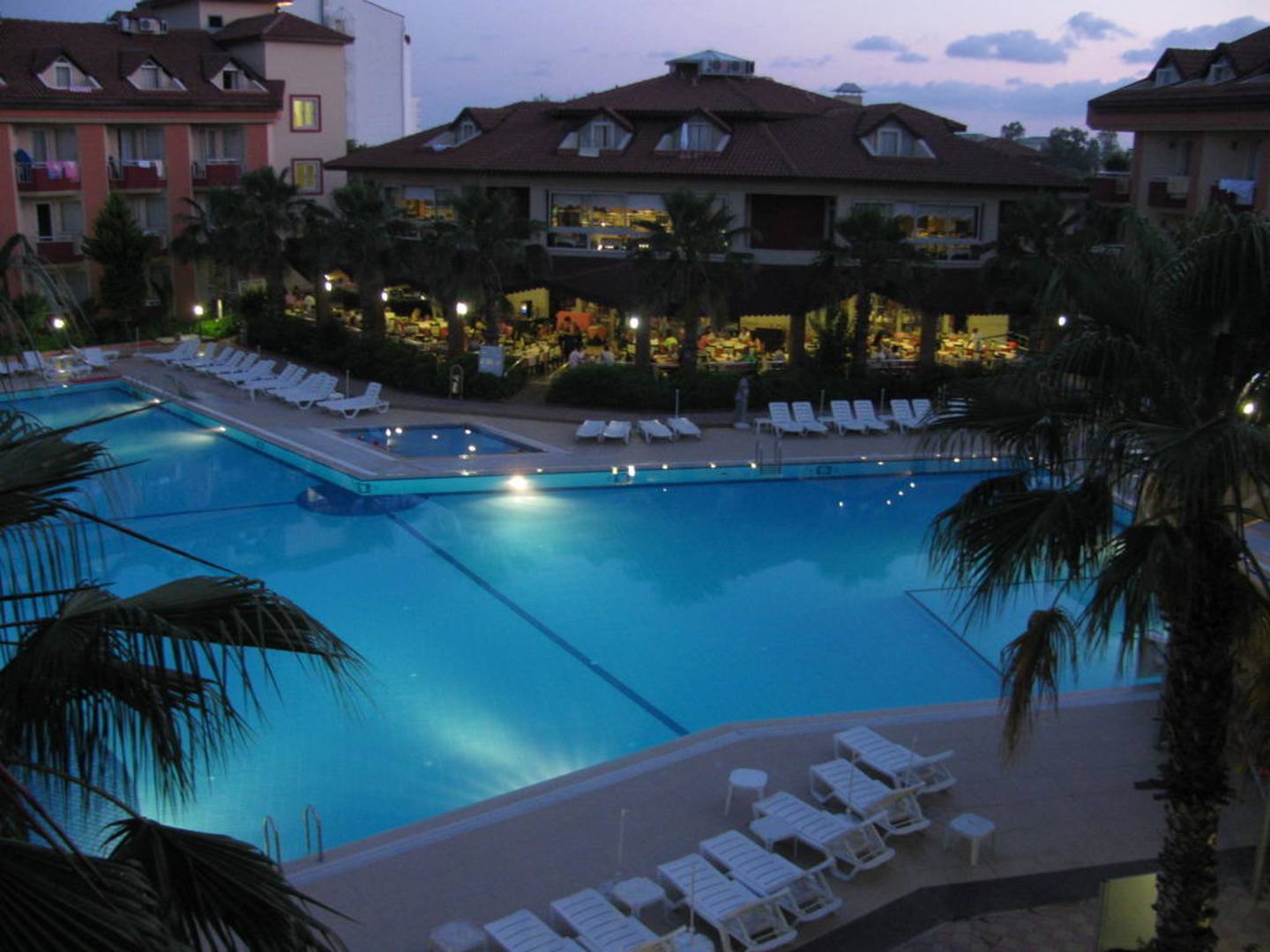 Blick auf den Pool und das Restaurant in der Abenddämmerung.