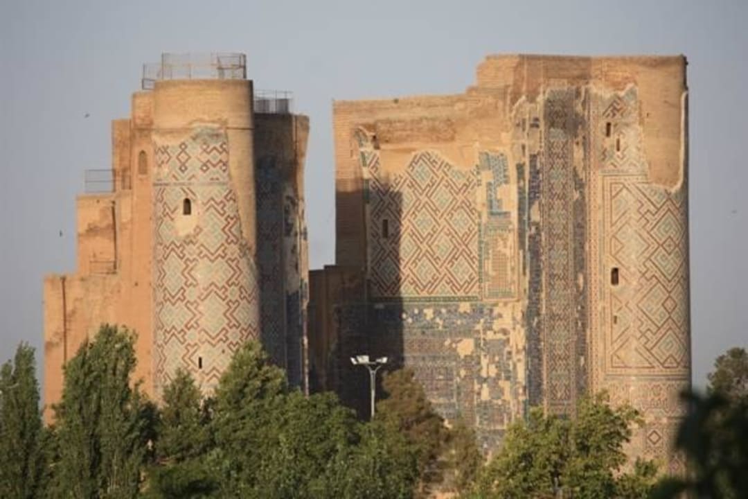Blick aus dem ZimmerfensterDas Bild zeigt eine Nahaufnahme des ehemaligen Sommerpalastes (Reste des Eingangsportals).