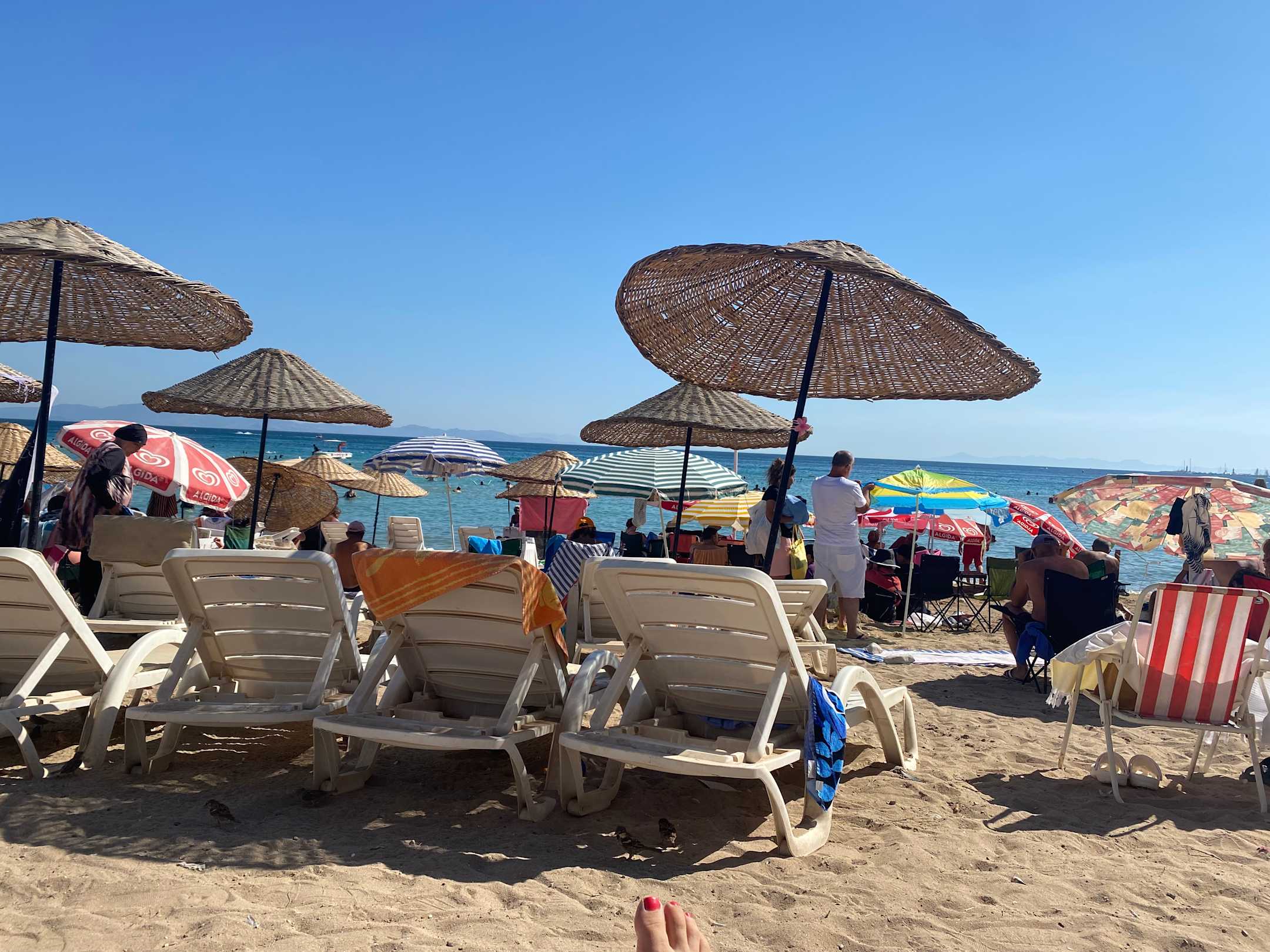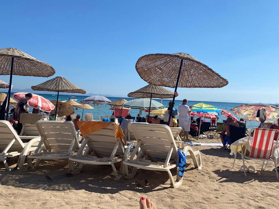 Leider gibt es keinen hoteleigenen Strand, es ist der öffentliche Strand, wo das Hotel ab Reihe 4 Liegen aufstellen darf. Es ist sehr sehr sehr voll. Der Weg zum Wasser ist vollgestellt.