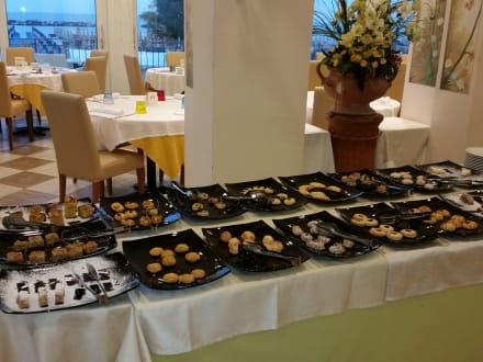 GastroDas Frühstücksbufffet,Süsses,im Hintergrund und der tolle Blick auf das Meer und den Strand!!