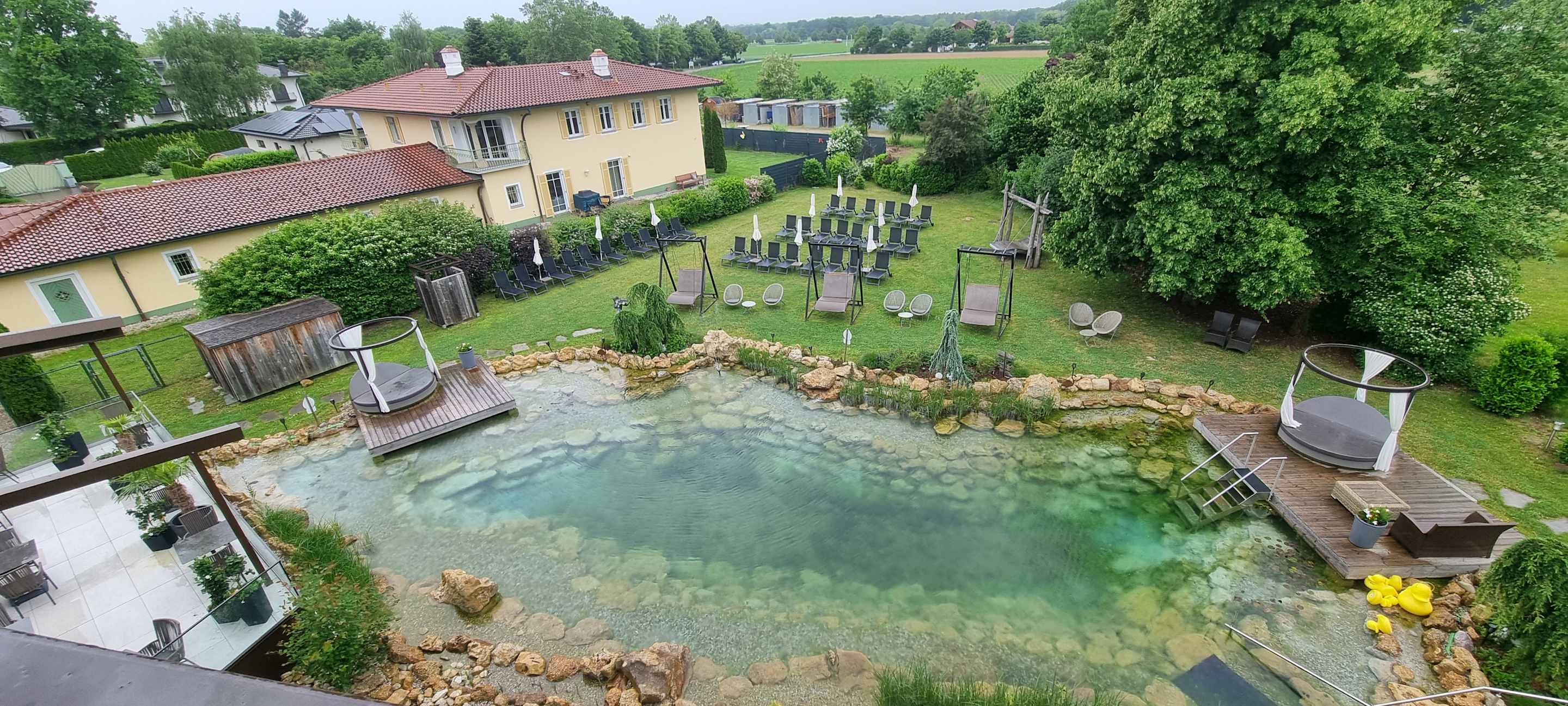 Aussicht vom Zimmer auf den hoteleigenen Naturbadeweiher.