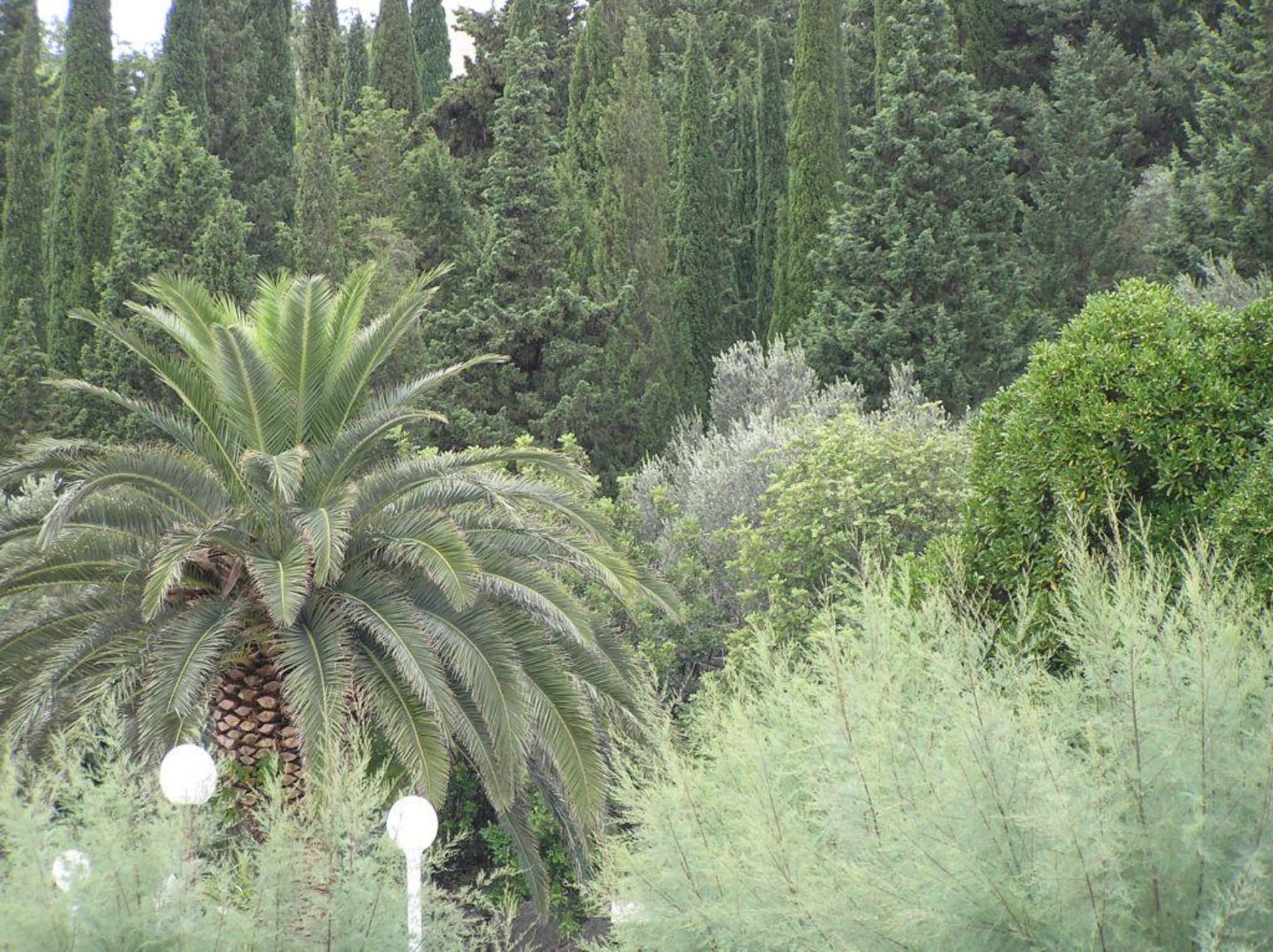 Palme am Pool mit Hotelpark. Gepflegter Park mit vielen Baumarten.