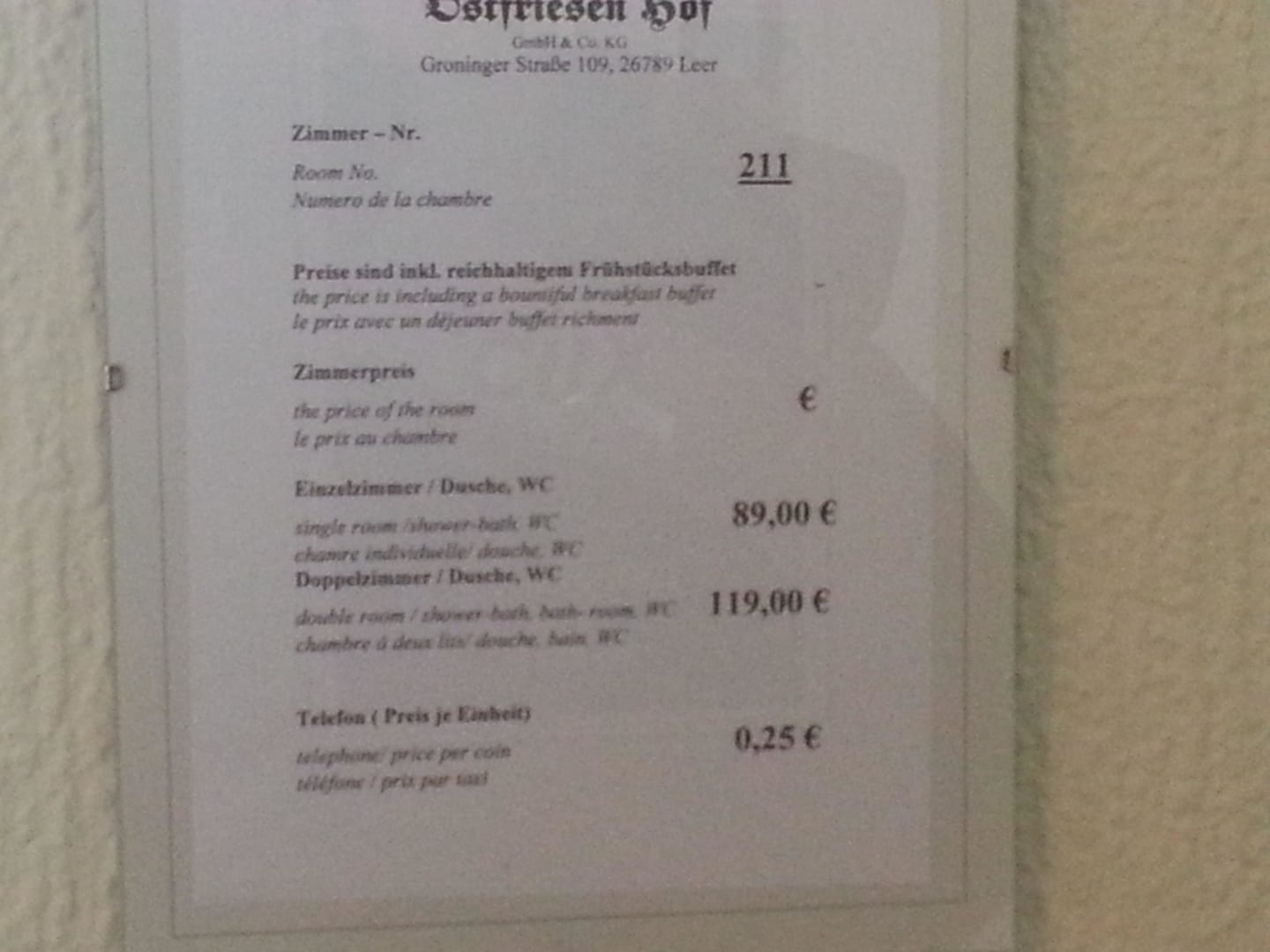 Preisliste Zimmer