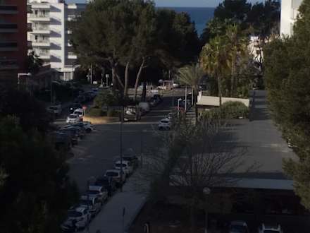 AusblickBlick vom Balkon zum Meer (im Hintergrund). Rechts unten: Poolanlage. Links unten: Die wenig befahrene Straße an der Hotelvorderseite