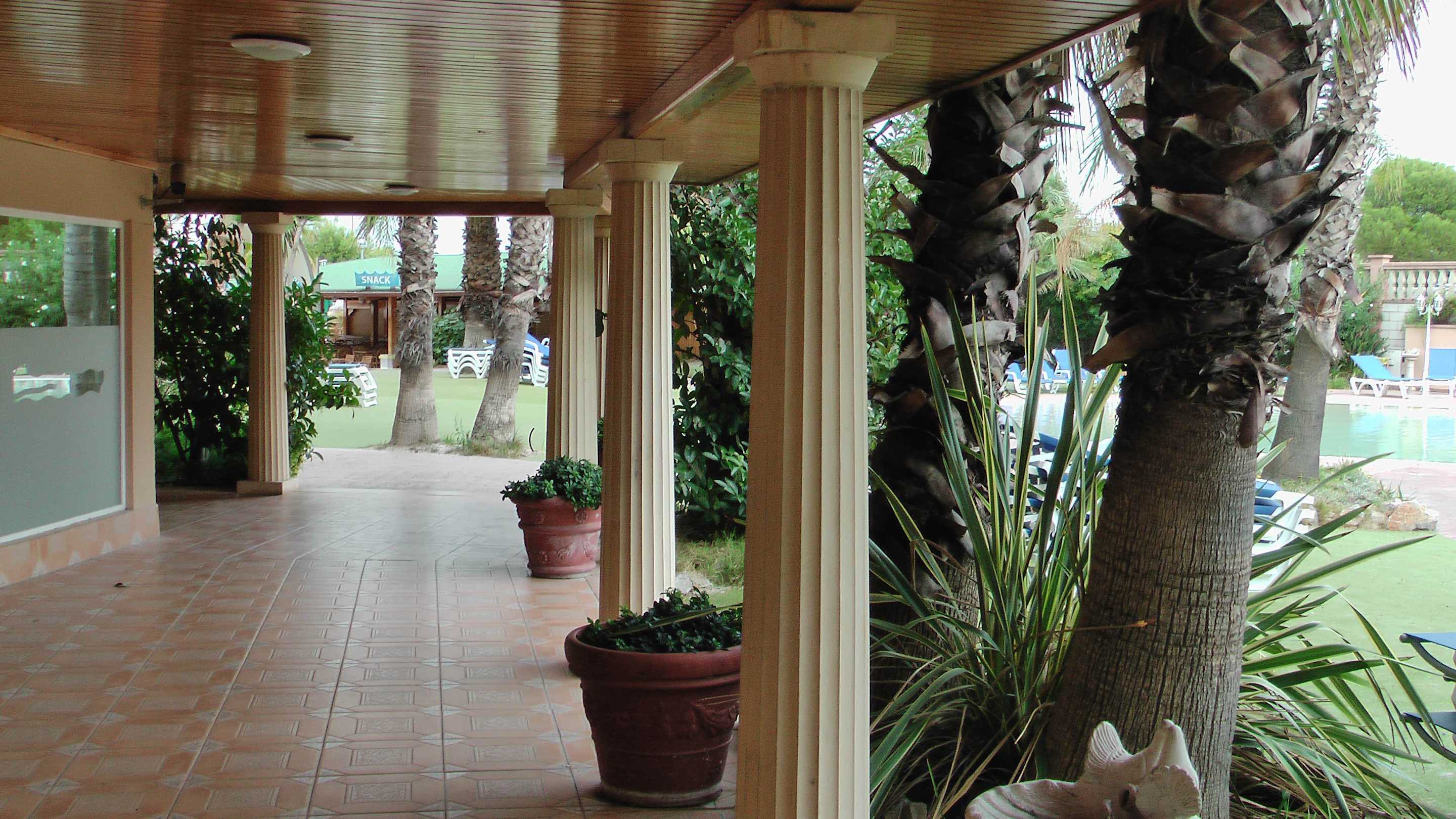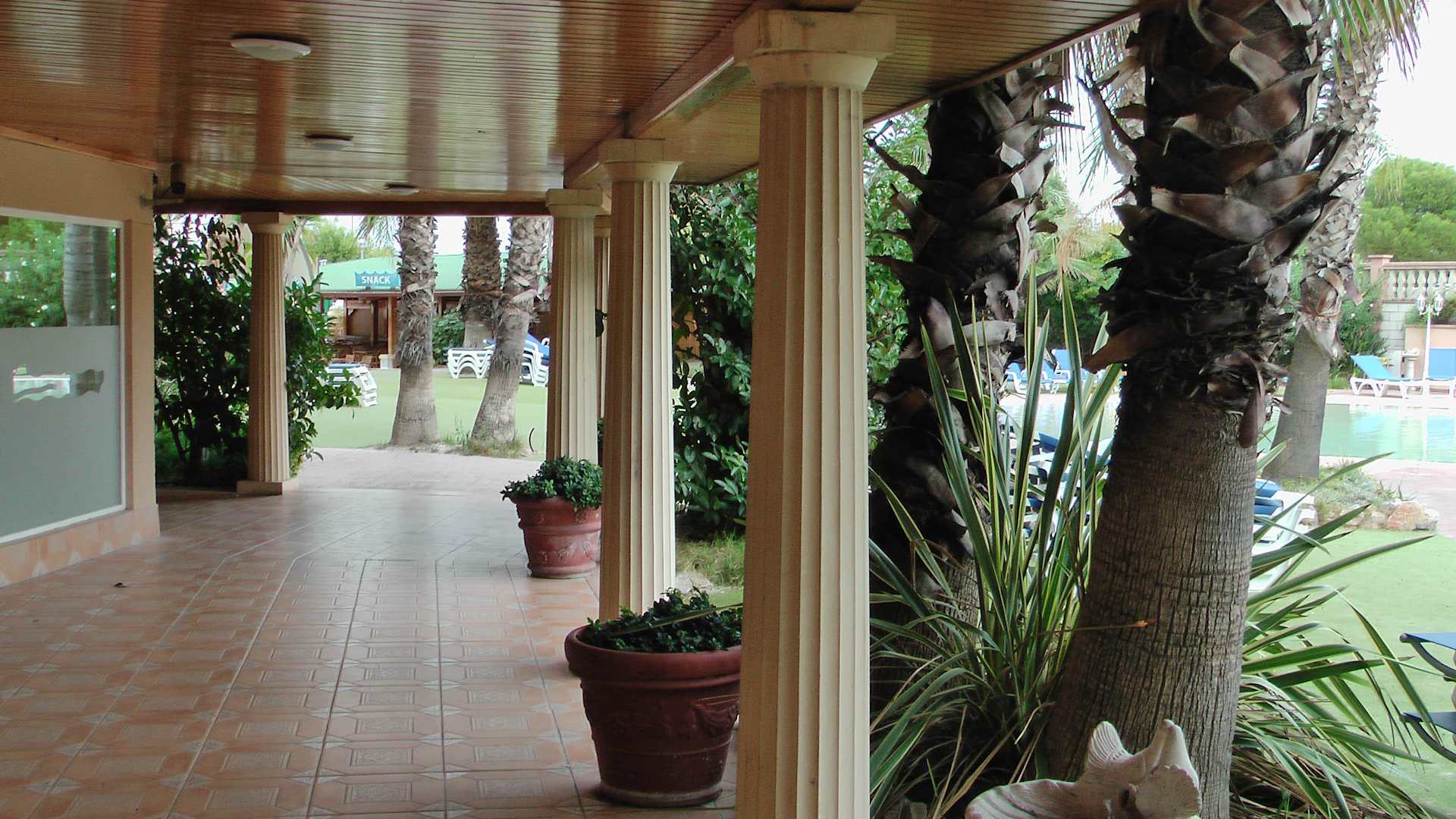 Weg vom Neben- zum Hauptgebäude (vorne ist die Bühne und Strandbar)