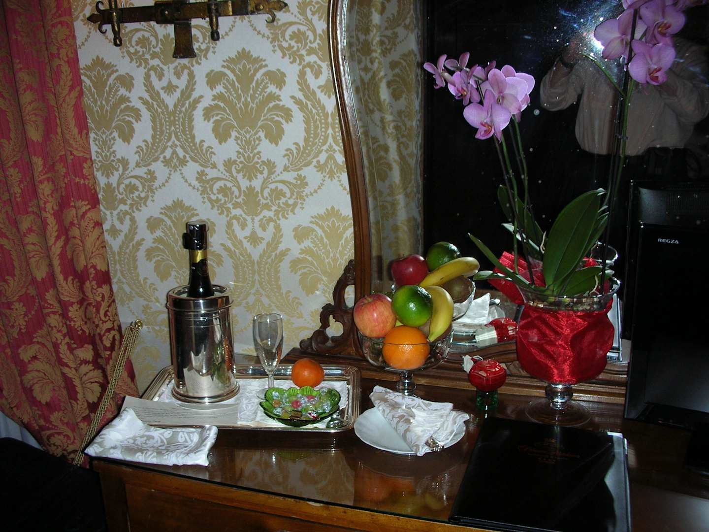 Willkommensgruss: Spumante, Orchideen, Früchte
