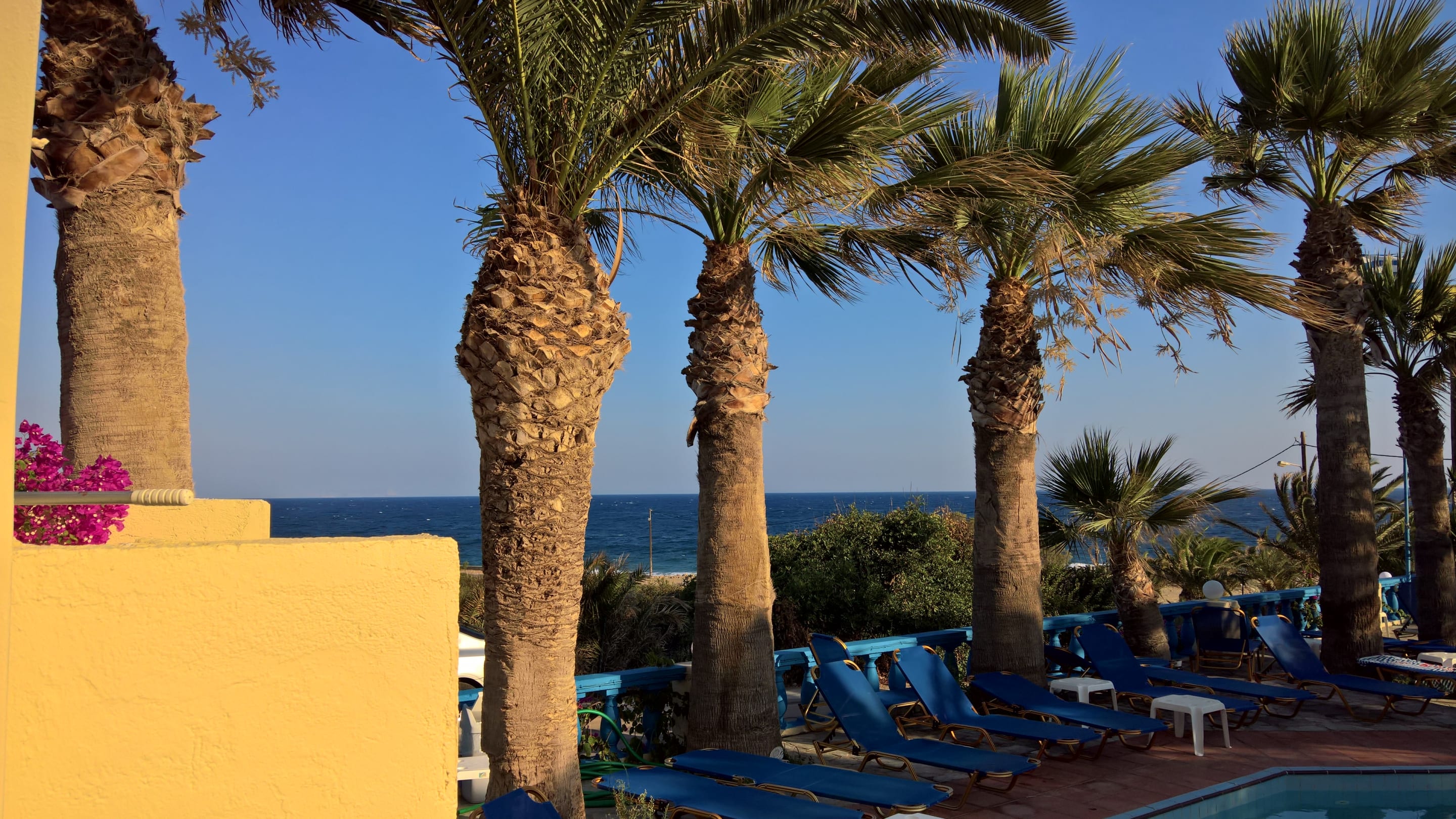 Poolbereich mit dem Meer und Palmen