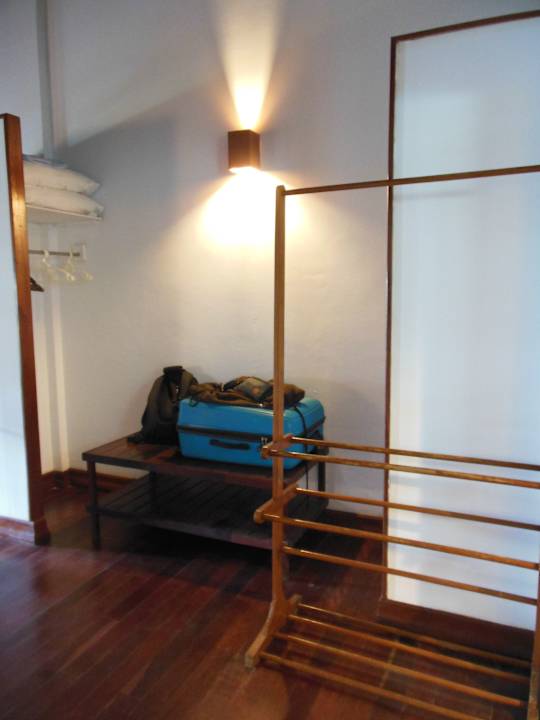 ZimmerLinks hinter Verkleidung die Kleiderstange mit Bügeln - vorne rechts das "Badehandtuchgestell" oder was auch immer man dort `drüberhängt